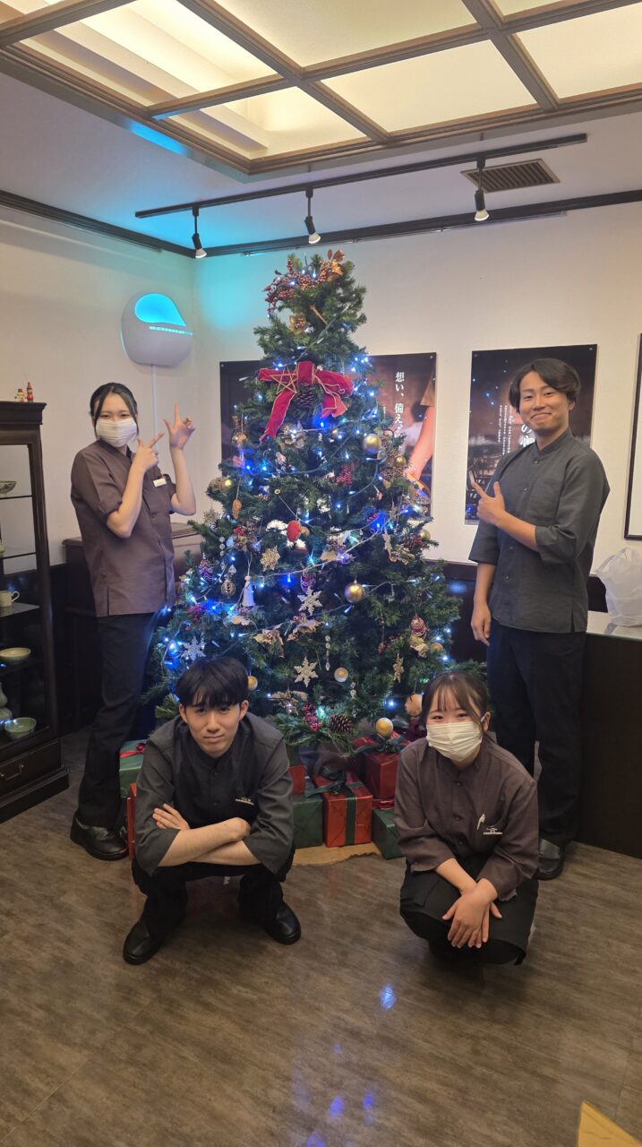 三田屋の小早川です。 今年も可愛い可愛いアルバイトさん達と営業あとにツリーを組み立てました。 今年も綺麗にできました👍、ツリーと一緒にお写真を撮るときは気軽にスタッフに声をおかけください。📸