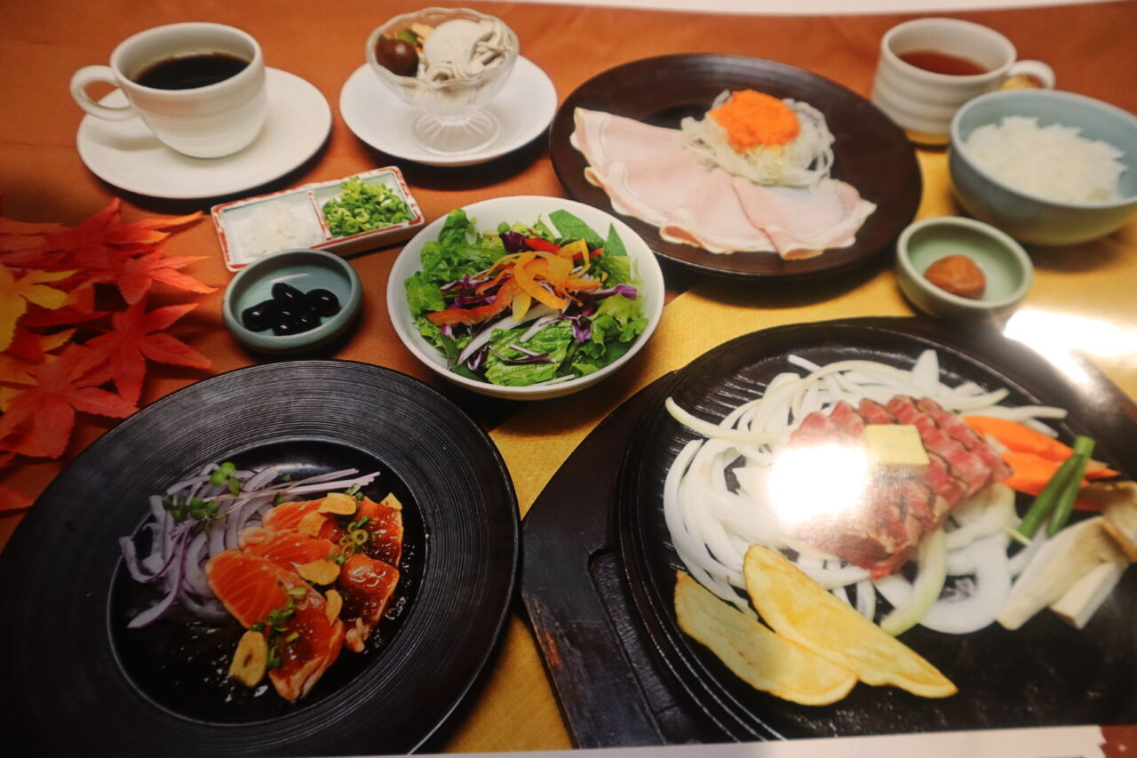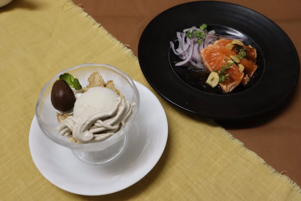 普段あじわえない迫力のあるピアノとベースの演奏を聴きながら、秋の味覚コースをご注文いただき、秋にぴったりな前菜のサーモンのタタキからはじめ、ステーキと栗ご飯でメインを楽しみ、最後は栗のジェラートで癒され、最後まで秋をたっぷり感じていただきます。
