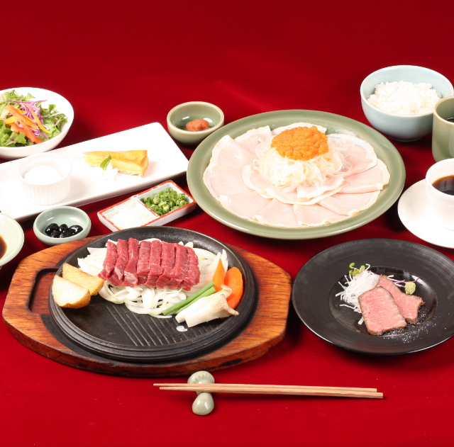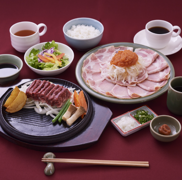 三田屋ハムのオードブル、サラダ、ローストビーフ(※1)、ビーフコンソメスープ、黒豆、ハラミステーキ(※2)、ご飯、梅干、デザート(※1)、コーヒー又は紅茶
