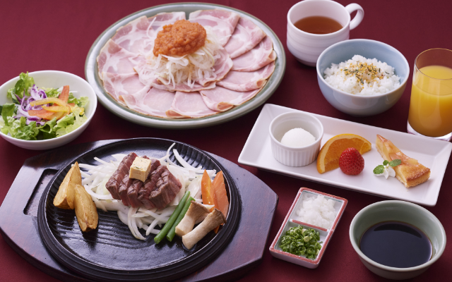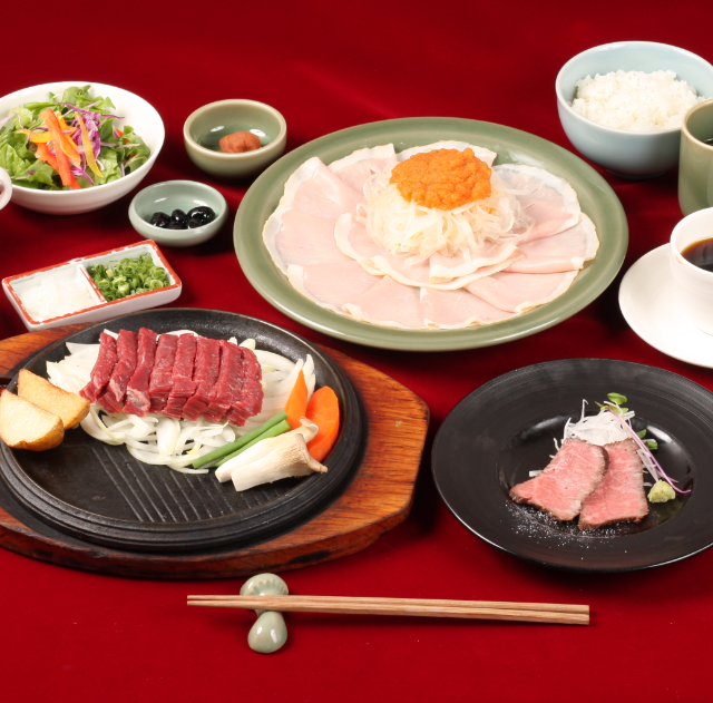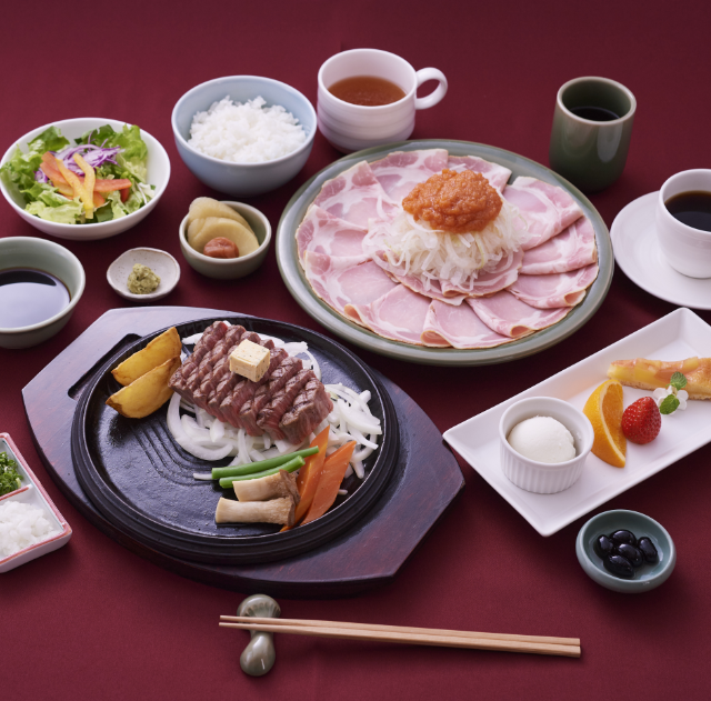 三田屋ハムのオードブル、サラダ、ローストビーフ、ビーフコンソメスープ、黒豆、ハラミステーキ※、ご飯、梅干、デザート、コーヒー又は紅茶