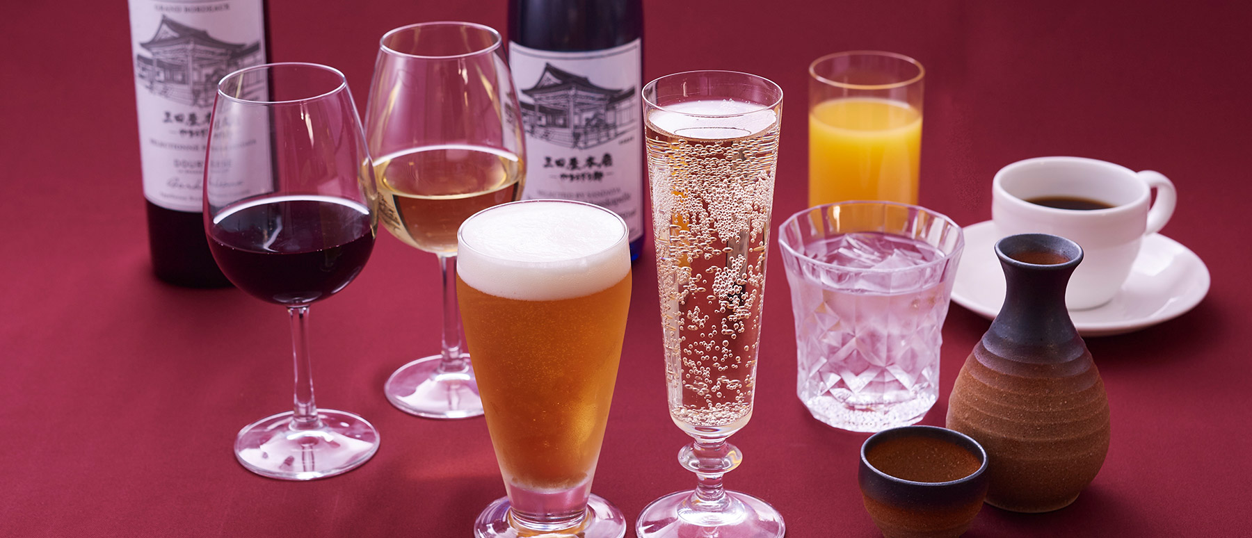 生ビール、赤ワイン、白ワイン、ロゼワイン、ソフトドリンク、梅酒、各種ノンアルコール