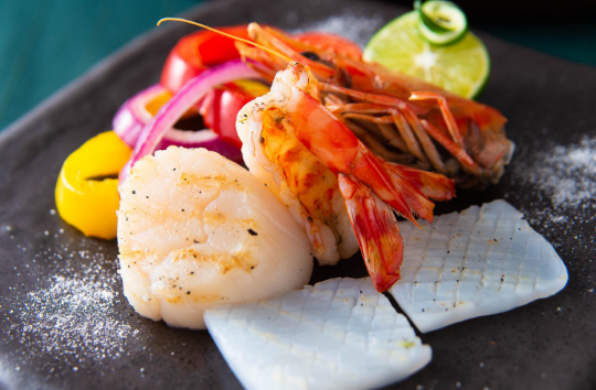 刺身でも食べていただける鮮度の良い、車海老、帆立、煽り烏賊を贅沢に鉄板焼きに。